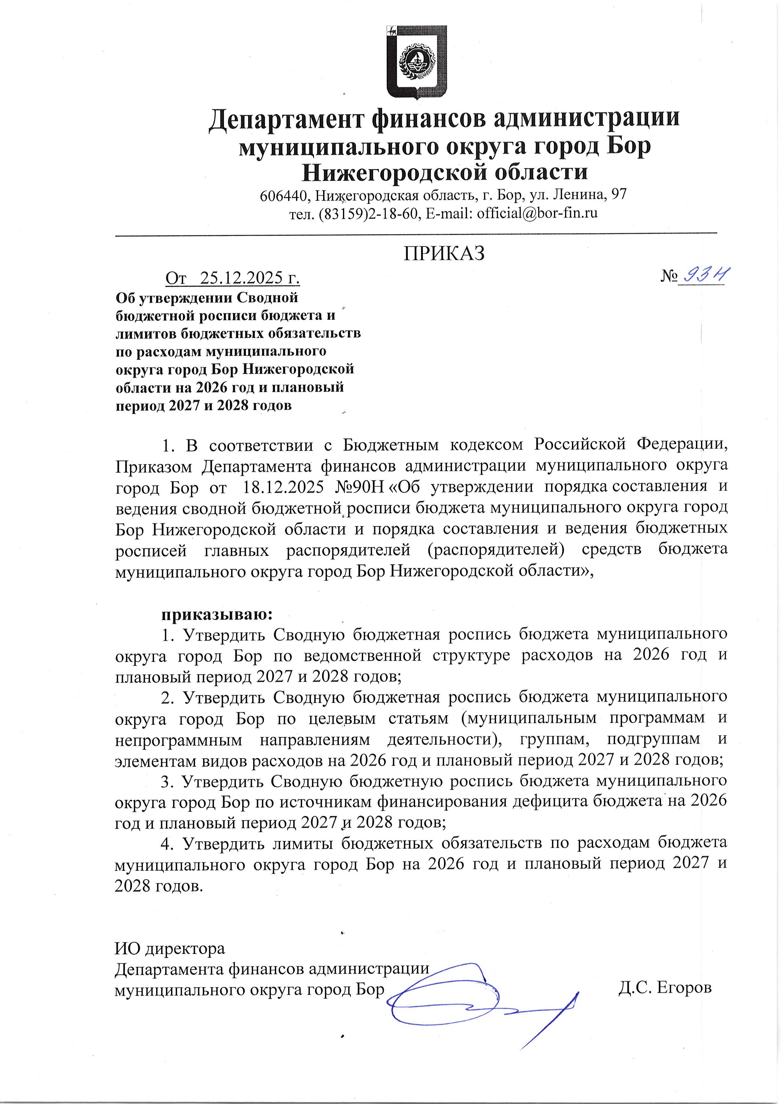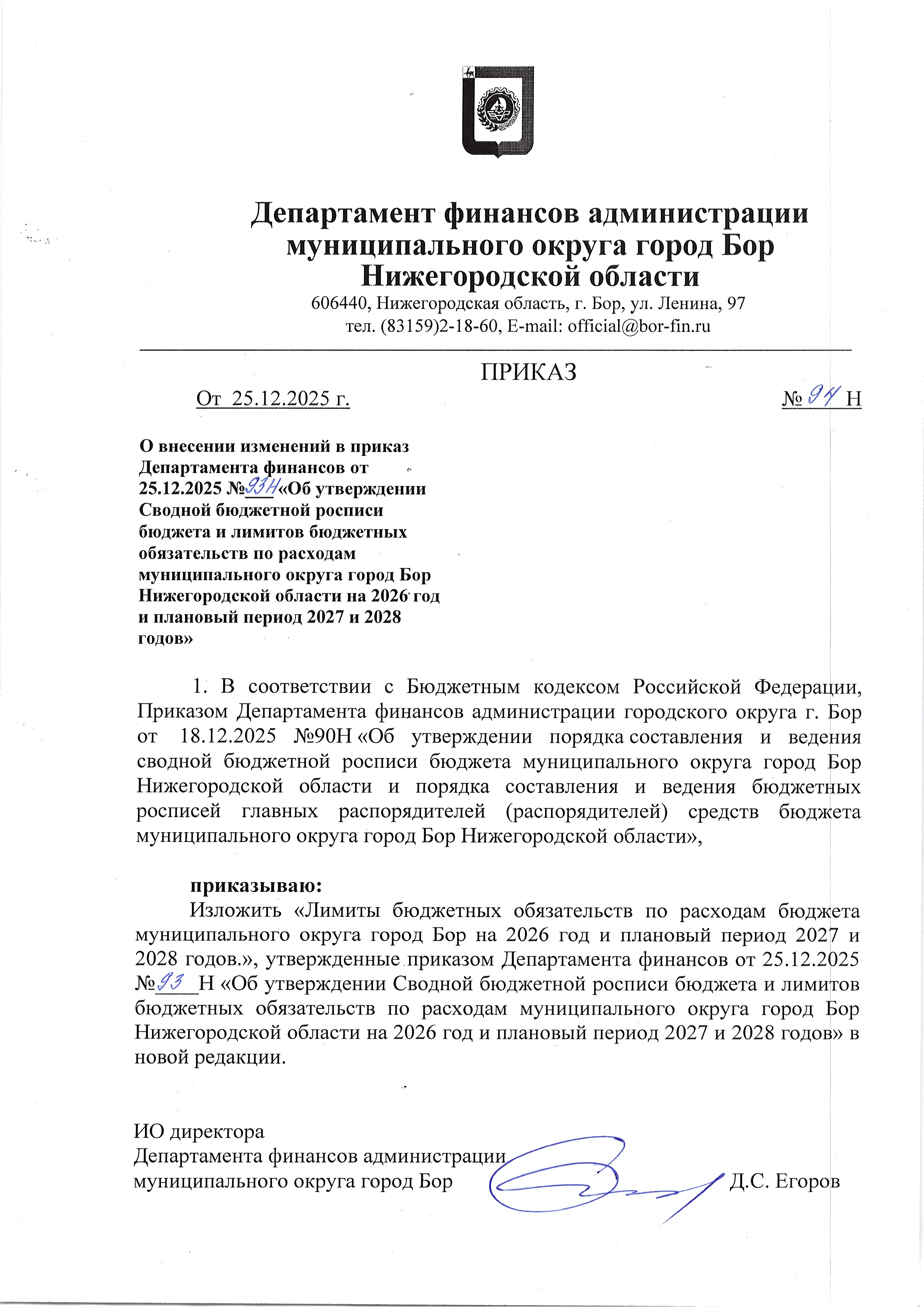 Приказ Департамента финансов от 25.12.2025 №94Н "О внесении изменений в приказ Департамента финансов от 25.12.2025 №93Н "Об утверждении Сводной бюджетной росписи бюджета и лимитов бюджетных обязательств по расходам муниципального округа город Бор" Приложение
